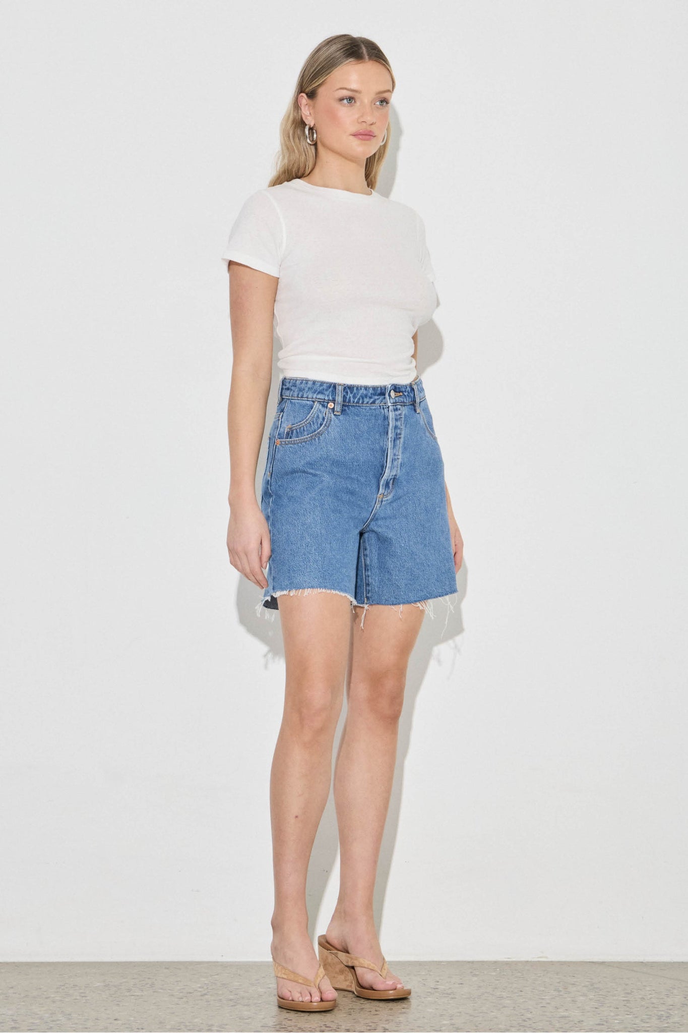 - Cutoff hem at mid thigh