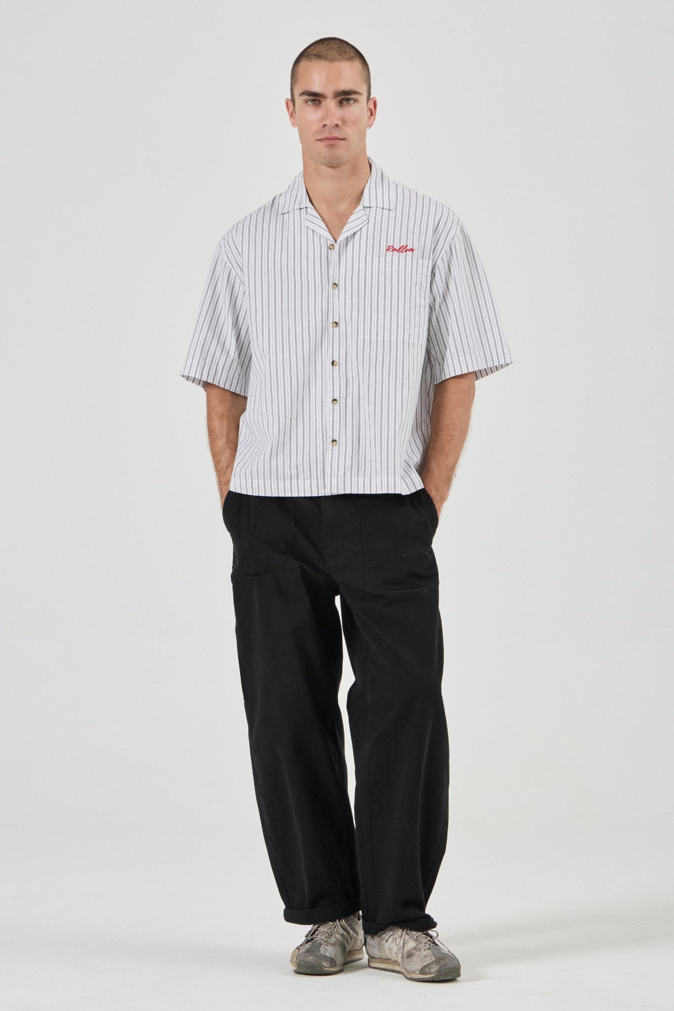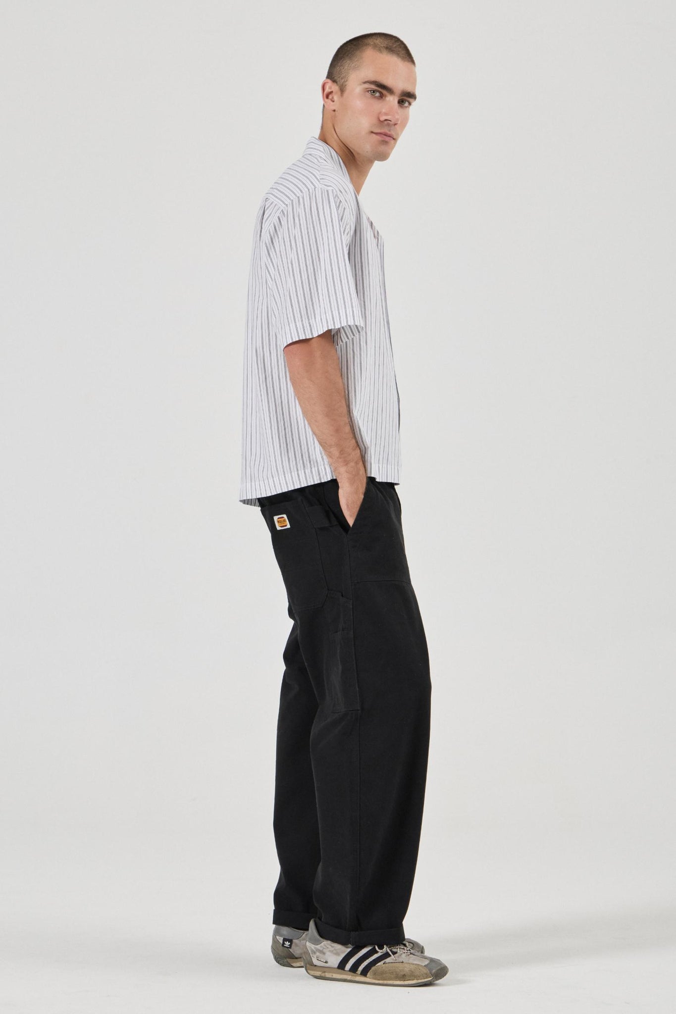 - Relaxed fit through the waistband, seat, and thigh, tapering and roll at the hem for a classic barrel-leg shape