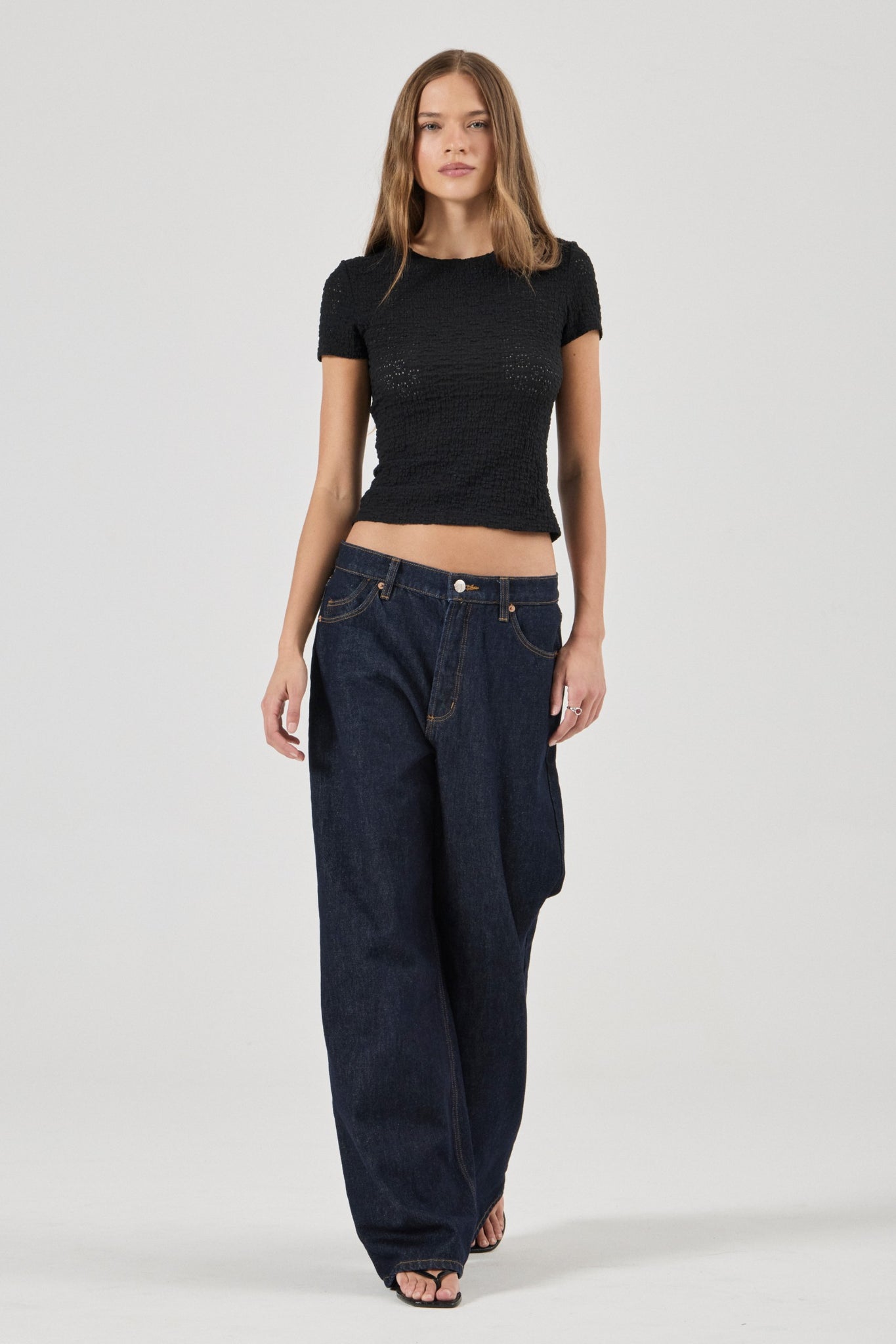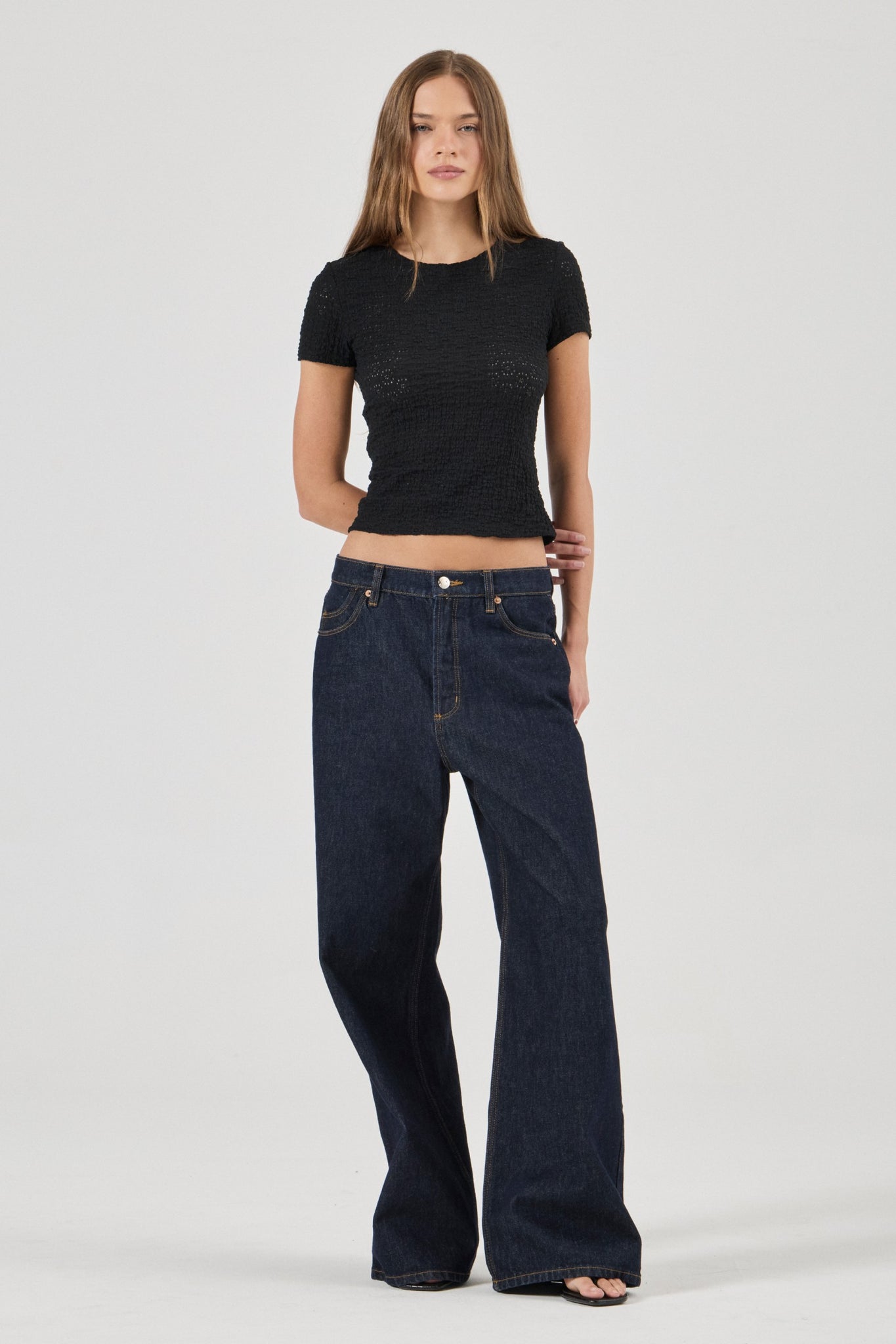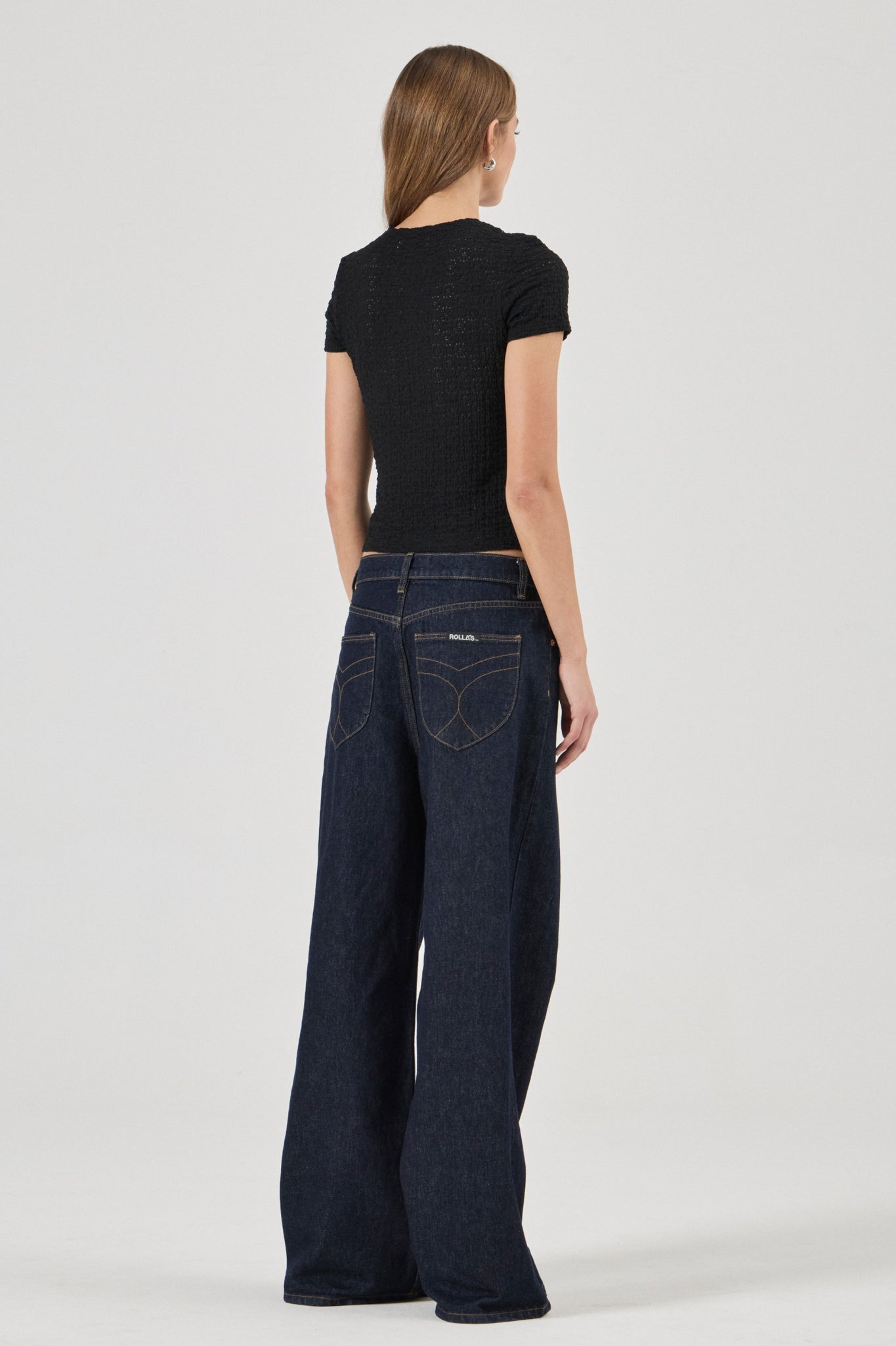 • Slim-fitting crew neck tee for a sleek, feminine silhouette